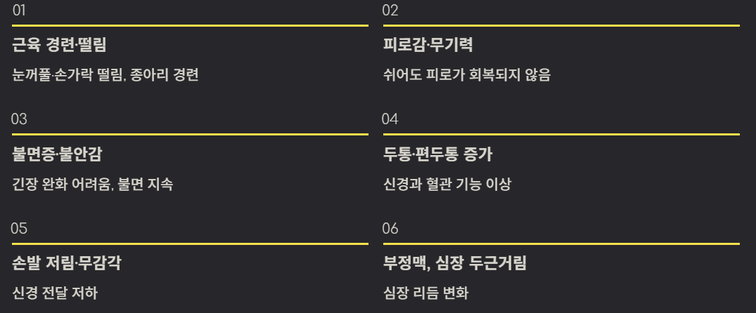 - 근육 경련·떨림: 눈꺼풀·손가락 떨림, 종아리 경련