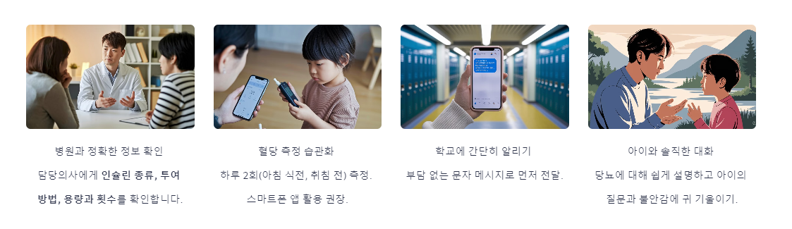 - 예시: "선생님, 아이가 소아당뇨 진단을 받아 학교에서 혈당 체크가 필요할 수 있습니다. 내일 다시 연락드리겠습니다."