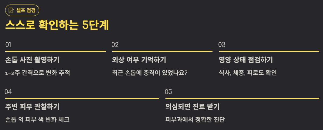 - 정기적인 셀프 체크: 손톱 색, 두께, 강도 등을 한 달에 한 번 점검해 보세요.